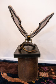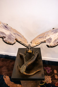 This one of a kind Butterfly piece is made of forged steel and natural materials. The two mirroring slabs used for this piece are made of Amethyst and Rose Quartz. The slabs inspired James Vilona to create something unique that would best show off these unique pieces of natural material. Vilona created this custom art piece in his studio in Berthoud, CO.